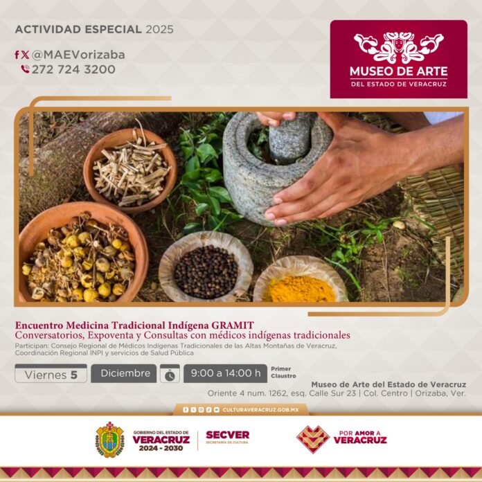 Xalapa, Ver., jueves 04 de diciembre de 2025.- La Secretaría de Cultura de Veracruz (SECVER) invita al Encuentro de Medicina Tradicional Indígena de las Altas Montañas, que se llevará a cabo este viernes 5 de diciembre, de 09:00 a 14:00 horas, en el Museo de Arte del Estado de Veracruz (MAEV), en colaboración con el Consejo Regional de Médicos Indígenas Tradicionales de las Altas Montañas, la Coordinación Regional INPI y Servicios de Salud Pública.