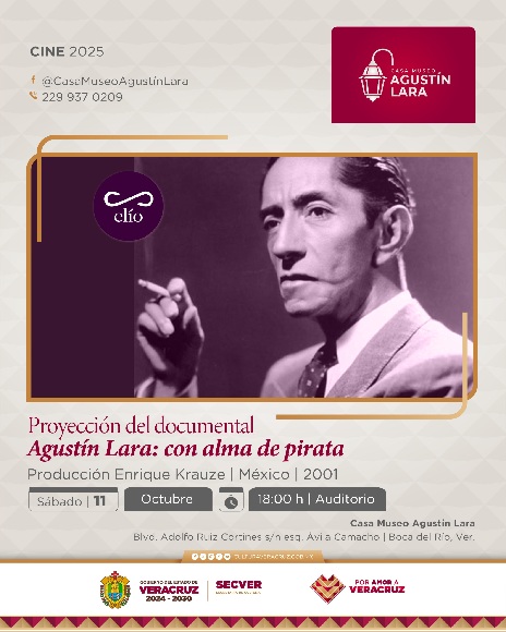 Xalapa, Ver., 09 de octubre de 2025.- La Secretaría de Cultura de Veracruz invita a la proyección del documental Agustín Lara: Con alma de pirata (2001) que se realizará este sábado a las 18:00 horas, en el auditorio de la Casa Museo Agustín Lara. La entrada es gratuita con aforo limitado.