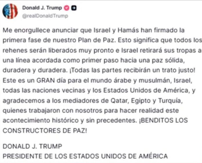 “Me enorgullece anunciar que Israel y Hamás han firmado la primera fase de nuestro Plan de Paz“, escribió.