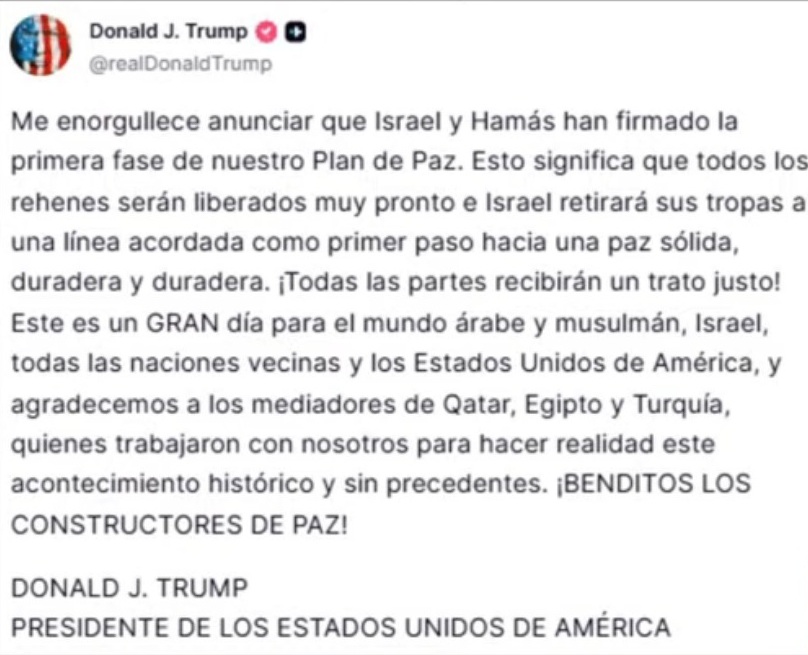 “¡Todas las partes recibirán un trato justo! Este es un GRAN día para el mundo árabe y musulmán, Israel, todas las naciones vecinas y los Estados Unidos de América, y agradecemos a los mediadores de Catar, Egipto y Turquía, quienes trabajaron con nosotros para hacer realidad este acontecimiento histórico y sin precedentes. ¡BENDITOS LOS CONSTRUCTORES DE PAZ!”, concluyó.