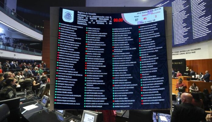 El dictamen fue avalado tanto en lo general como en lo particular con 87 votos a favor y 41 en contra, alcanzando así la mayoría calificada necesaria para reformar la Constitución. Sin embargo, durante la discusión en lo particular, el Pleno aceptó una reserva presentada por la senadora Lizeth Sánchez García, del Partido del Trabajo, para suprimir los cambios al artículo 35 relacionados con la revocación de mandato.