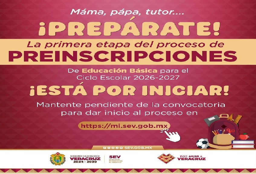 Xalapa, Ver., 11 de enero de 2026.– En próximos días la Secretaría de Educación de Veracruz (SEV) dará a conocer la convocatoria para el proceso de preinscripciones de Educación Básica del ciclo escolar 2026–2027, por lo que convoca a madres, padres de familia y tutores a mantenerse atentos a la publicación oficial.
