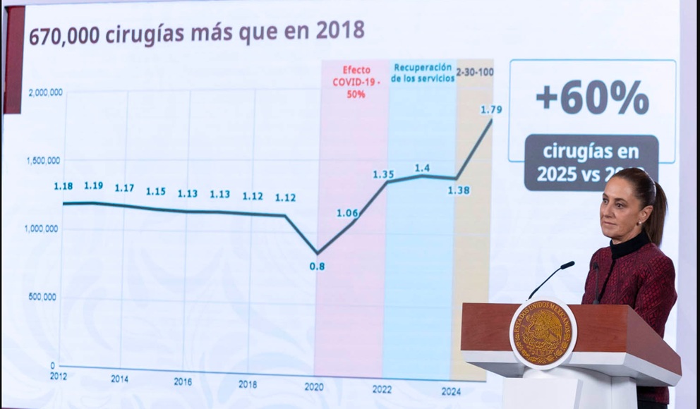 *Los datos duros provienen de dos fuentes: el INEGI, que reporta el índice de mortalidad en México, y reporte de la mañanera del 13 de enero de 2026, que detalla cifras de cirugías y consultas en IMSS, ISSSTE e IMSS Bienestar durante 2025.