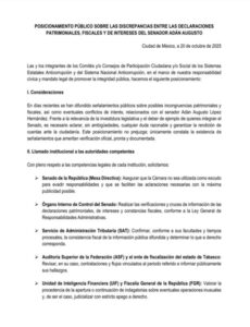 El documento, respaldado por representantes de los sistemas anticorrupción de entidades como Puebla, Durango, Quintana Roo, Michoacán y Jalisco, plantea la necesidad de esclarecer cualquier duda razonable sobre el patrimonio del senador y garantizar la rendición de cuentas ante la ciudadanía.