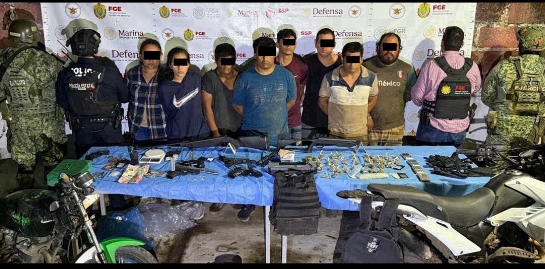 Asimismo, durante un cateo en el municipio de San Andrés Tuxtla, ocho personas fueron detenidas, decomisándoles tres armas de fuego cortas (hechizas) y dos réplicas, dos rifles de aire, cargadores y cartuchos útiles; cinco dosis y dos bolsas de una sustancia con características del cristal, 35 dosis de hierba seca similar a la marihuana y pastillas azules; equipamiento táctico, radios de comunicación, dinero, básculas y tres motocicletas con reporte de robo.