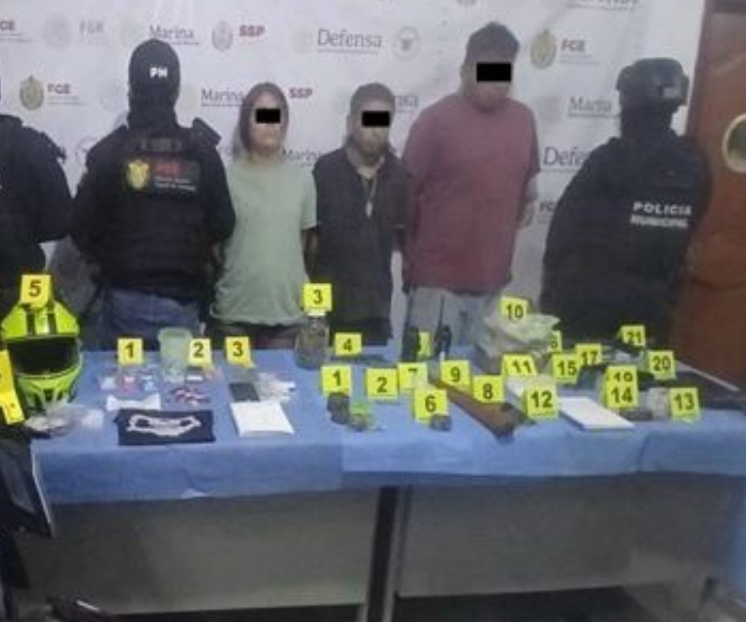 En apoyo a la Fiscalía General del Estado, durante cateos fueron aprehendidas cuatro personas, decomisándoles tres armas de fuego largas y tres cortas, cargadores, cartuchos útiles; 15 bolsas y un frasco con hierba verde similar a la marihuana; 35 bolsas, 10 dosis y un recipiente con una sustancia con características de cristal; armas blancas; radios de comunicación; básculas; una trituradora; teléfonos móviles y una motocicleta sin reporte de robo.