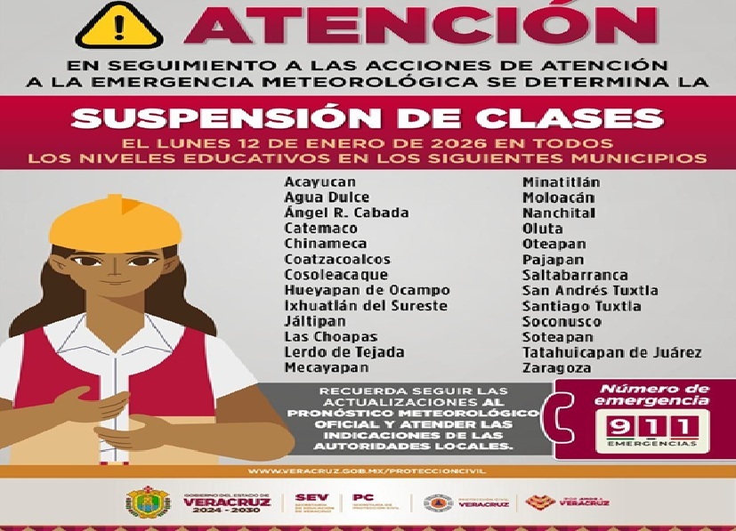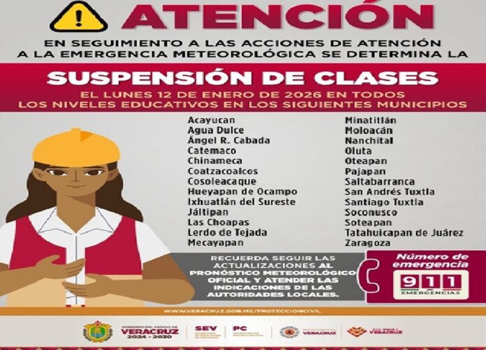 Xalapa, Ver., 11 de enero de 2026.– El Comité Estatal de Emergencias, en coordinación con la Secretaría de Educación de Veracruz, determinó la suspensión de clases el lunes 12 de enero, en todos los niveles educativos, ante el pronóstico de lluvias significativas derivadas del Frente Frío 27, en 26 municipios del sur del estado.