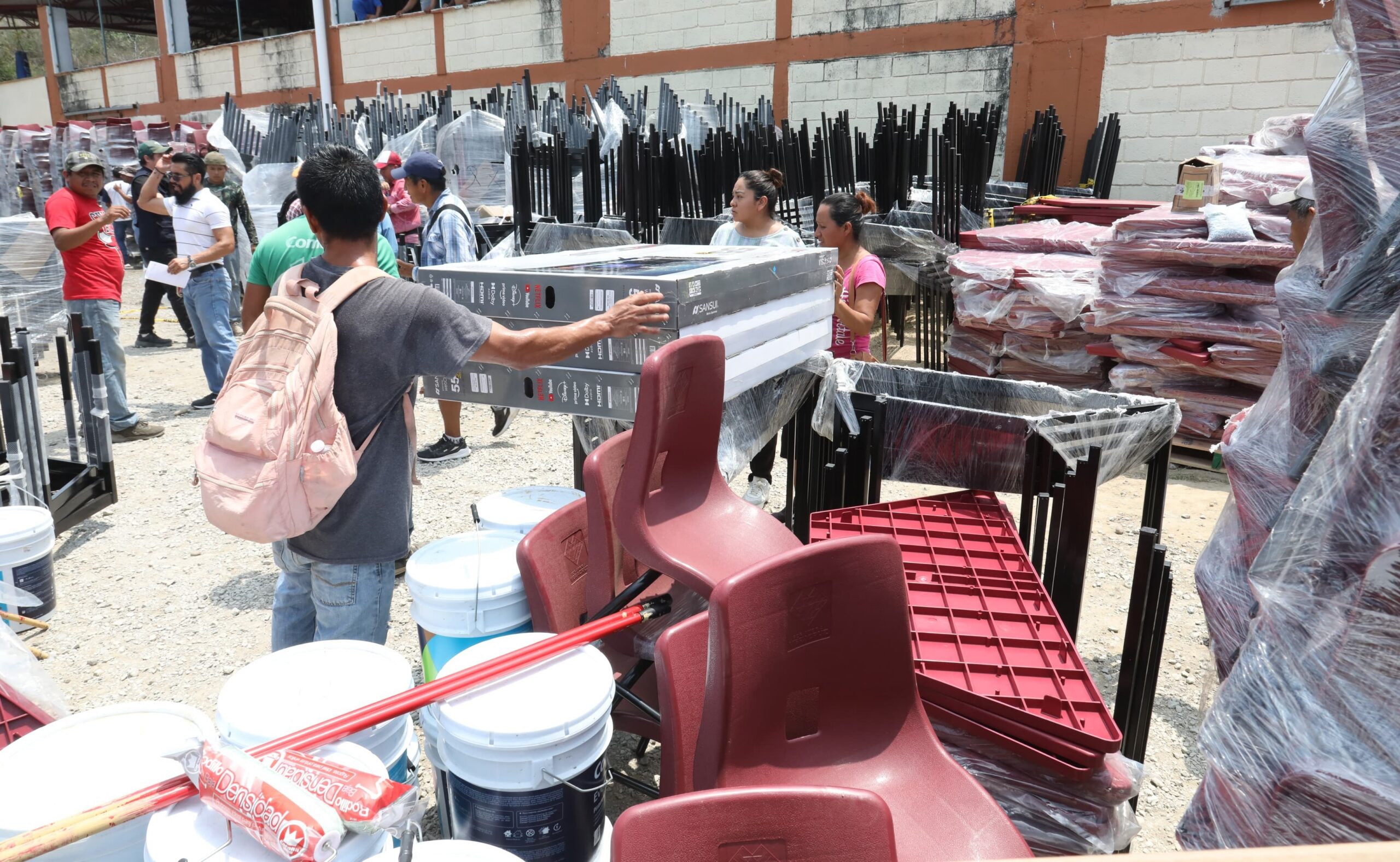 Durante la entrega de mobiliario y equipo en el municipio de Tempoal, la dependencia distribuyó insumos en 145 escuelas: más de 3 mil piezas, entre sillas, mesas, pupitres, gabinetes y proyectores, mil 276 cubetas de impermeabilizante, material para pisos y baños, así como 5 mil 300 kits de mochilas con útiles escolares.