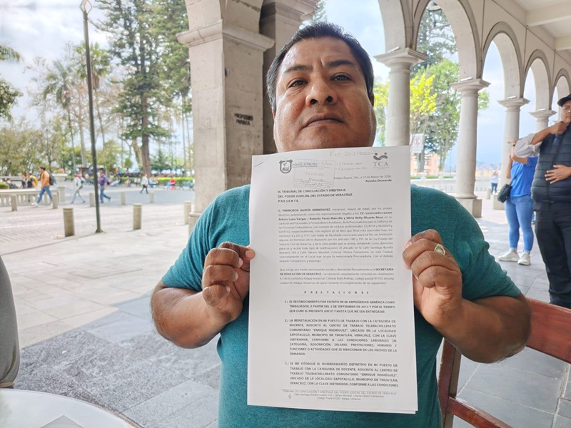 11.03.2026 Xalapa, Ver.- El docente Francisco García Hernández denunció públicamente su despido injustificado del telebachillerato comunitario en Veracruz, luego de haber laborado durante 13 años con contratos semestrales consecutivos, situación por la cual presentó una demanda ante el Tribunal de Conciliación y Arbitraje.