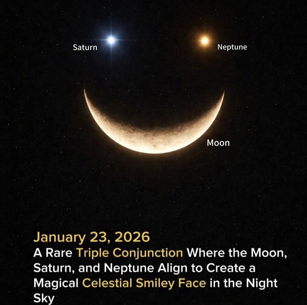 22.01.2026. Xalapa, Ver.- El cielo nocturno ofrecerá un espectáculo poco común: la Luna, Saturno y Neptuno se alinearán de manera tal que, vistos desde la Tierra, dibujarán la figura de una carita sonriente. Este fenómeno astronómico, conocido como triple conjunción, es considerado raro por la coincidencia de tres cuerpos celestes en una misma región del firmamento y por la disposición que adoptarán, semejante a un rostro humano.