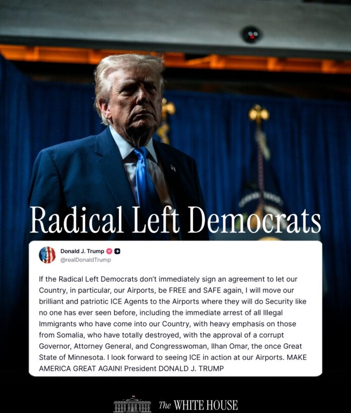 “Si los demócratas de la izquierda radical no firman de inmediato un acuerdo para permitir que nuestro país, en particular nuestros aeropuertos, vuelvan a ser libres y seguros, trasladaré a nuestros brillantes y patrióticos agentes de ICE a los aeropuertos, donde harán la seguridad como nadie la ha visto antes…” escribió el mandatario, en un mensaje que refleja la tensión creciente entre la Casa Blanca y el Congreso.