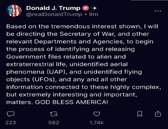 19.02.2026 .- El presidente de Estados Unidos, Donald Trump, anunció a través de su red social Truth Social que ha instruido a su gobierno a iniciar un proceso de identificación y divulgación de todos los archivos oficiales relacionados con vida extraterrestre, objetos voladores no identificados (OVNIs) y fenómenos aéreos no identificados (FANI).