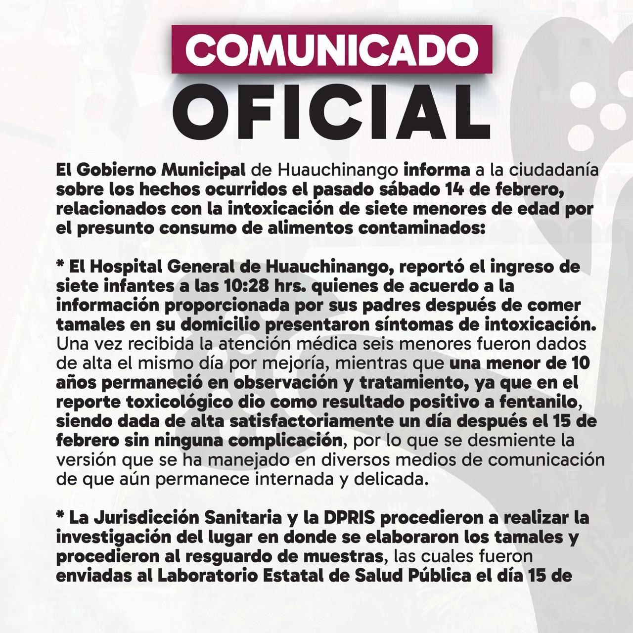 18.02.2025Huauchinango, Puebla.– El Gobierno Municipal de Huauchinango informó sobre la intoxicación de siete menores de edad ocurrida el pasado 14 de febrero, presuntamente relacionada con el consumo de alimentos contaminados en un domicilio particular.