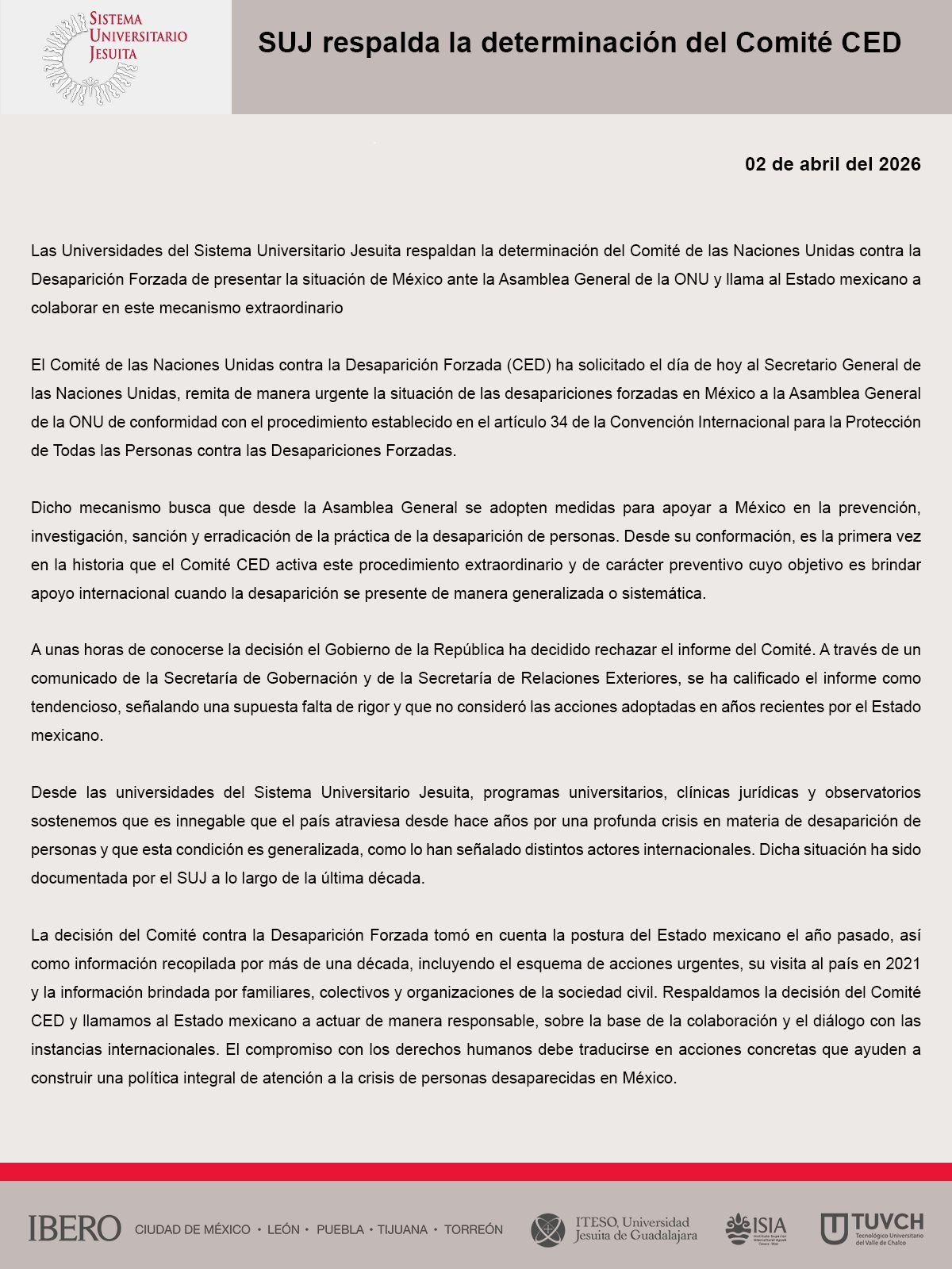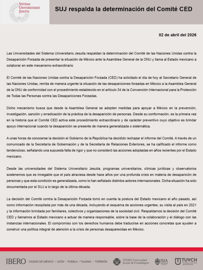 03.04.2026 El Sistema Universitario Jesuita (SUJ) emitió un comunicado en el que respalda la determinación del Comité de las Naciones Unidas contra la Desaparición Forzada (CED), que decidió presentar la situación de México ante la Asamblea General de la ONU. La decisión del Comité, inédita en su historia, activa un procedimiento extraordinario de carácter preventivo para atender casos en los que la desaparición de personas se presenta de manera generalizada o sistemática.