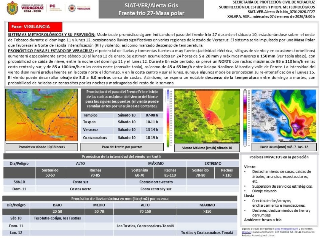 Xalapa, Ver., 7 de enero de 2026. A partir del sábado 10, el FF27 y su masa de aire frío de origen #polar tendrán estancia sobre el estado de Veracruz, incrementando el potencial de lluvias y tormentas, así como un evento de Norte fuerte a violento, aumento del nivel de oleaje y un marcado descenso de temperaturas; por lo que se recomienda extremar las precauciones necesarias.