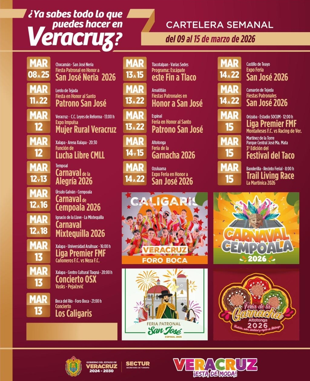 Xalapa, Ver., martes 10 de marzo de 2026.- La Secretaría de Turismo (SECTUR) invita a la ciudadanía y a visitantes a disfrutar de la cartelera semanal de actividades que se realizarán en distintas regiones, con festividades patronales, carnavales, conciertos, eventos deportivos y encuentros gastronómicos que reflejan la diversidad cultural y turística de Veracruz.