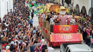 Veracruz, Ver., 31 de diciembre de 2025.- Entre la algarabía que caracteriza al pueblo jarocho y en la tierra que dio origen a la tradición de El Viejo, dio inicio el primer desfile Despide el Año Viejo en Veracruz, encabezado por una de las tres figuras monumentales que conformaron el contingente.
