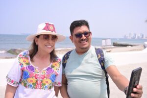 Acompañada por la presidenta municipal, Rosa María Hernández Espejo, y el subsecretario de Promoción y Atención Turística, Jorge Flores Lara, saludó a familias, prestadores de servicios y visitantes que disfrutan de la jornada en un entorno ordenado.