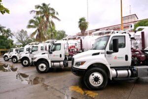 Poza Rica, Ver., lunes 08 de diciembre de 2025.- La gobernadora Rocío Nahle García encabezó la recepción de 24 unidades —entre camiones de bomberos, de basura y de desazolve tipo vactor, ambulancias y pipas— destinadas a 15 municipios, donadas por Petróleos Mexicanos (Pemex) como parte del Programa de Apoyo a la Comunidad y Medio Ambiente.