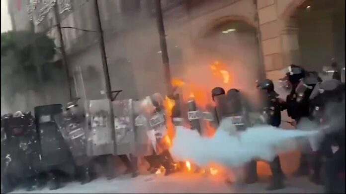 Los encapuchados incluso quemaron chalecos, cascos y escudos arrebatados a los policías, haciendo una fogata cerca del asta central del Zócalo. Un local ardió en llamas tras el lanzamiento de bombas molotov, aunque fue controlado por los cuerpos de emergencia.