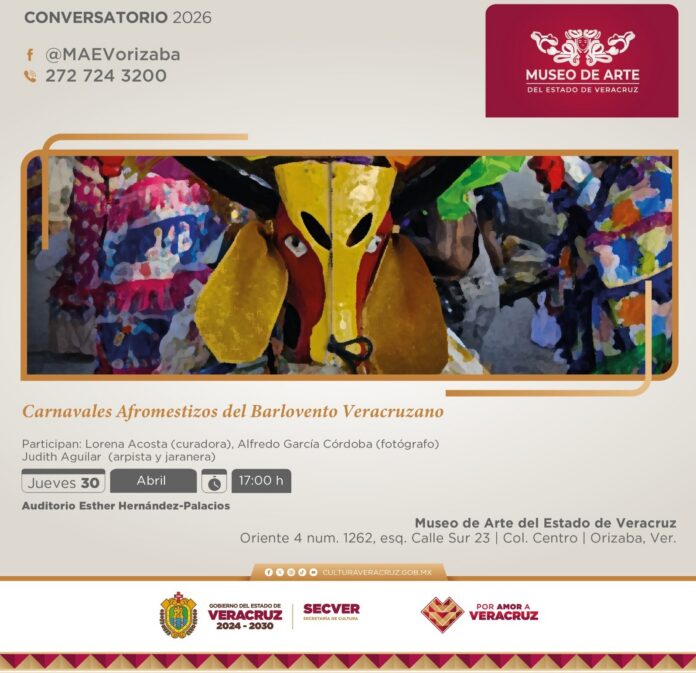 Xalapa, Ver., 28 de abril de 2026.- La Secretaría de Cultura de Veracruz invita a conocer la exposición Carnavales afromestizos del Barlovento veracruzano, del 30 de abril al 30 de agosto en la Sala Permanente de Arte Popular del Museo de Arte del Estado de Veracruz (MAEV), en Orizaba, de martes a domingo, en horario de 9:30 a 18:00 horas. La entrada es gratuita.