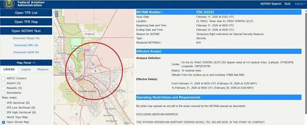 11.02.2026 EEUU-México.- La Administración Federal de Aviación de Estados Unidos (FAA, por sus siglas en inglés) anunció la noche del martes 10 de febrero la suspensión de todos los vuelos hacia y desde el Aeropuerto Internacional de El Paso, Texas.