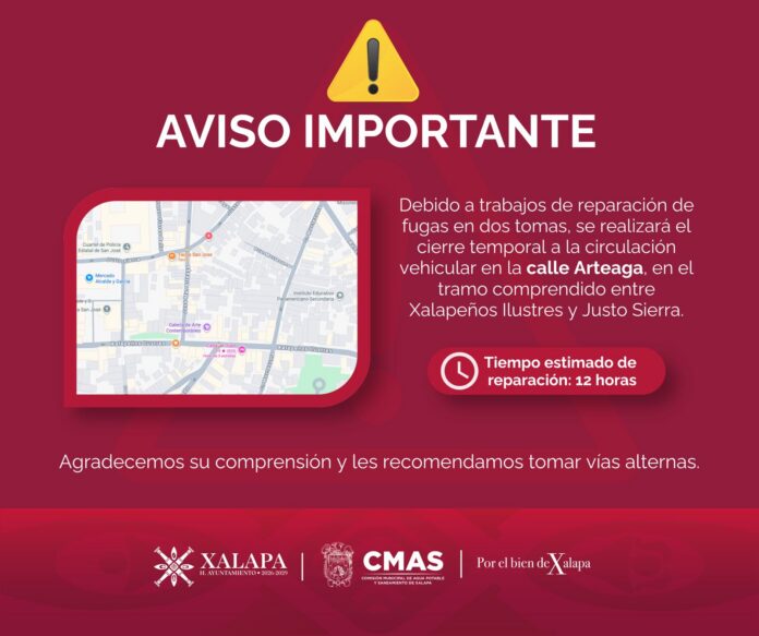 El Ayuntamiento de Xalapa y la Comisión Municipal de Agua y Saneamiento informaron que la circulación vehicular permanecerá cerrada en la calle Arteaga, entre Xalapeños Ilustres y Justo Sierra, debido a trabajos de reparación en dos tomas de agua. El tiempo estimado de las labores es de 12 horas. Se recomienda a la ciudadanía tomar vías alternas y se agradece su comprensión.