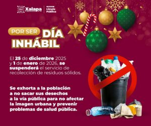17.12.2025 Xalapa, Ver.- El Ayuntamiento de Xalapa, a través de la Dirección de Limpia Pública, informa a la ciudadanía que por ser días inhábiles, el próximo 25 de diciembre y 1 de enero se suspenderá el servicio de recolección de residuos sólidos.