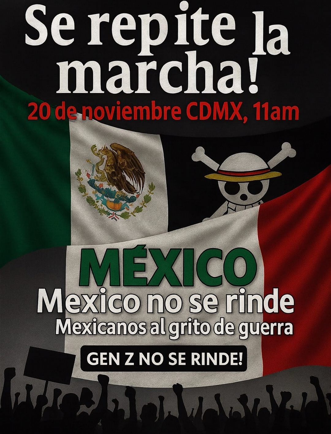 El movimiento Generación Z así anuncia este domingo una nueva marcha en la Ciudad de México para el próximo 20 de noviembre.
